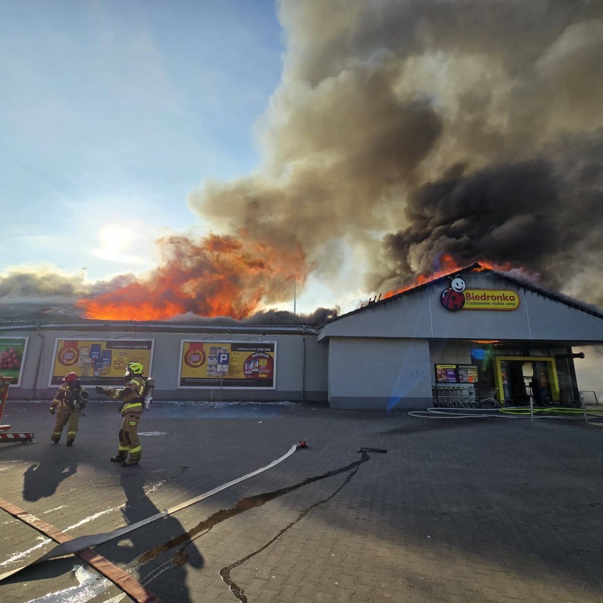 23 zastępy straży pożarnej walczyły z pożarem sklepu Biedronka przy ulicy Ogrodowej w Polkowicach. Dym wydobywający się z obiektu zauważono dziś tj. 1 lutego 2026 roku o godzinie 10:30. Ogień szybko rozprzestrzenił się na cały budynek. Po kilkunastu minutach akcji gaśniczej dach sklepu uległ zawaleniu. Podczas działań poszkodowanych zostało dw...