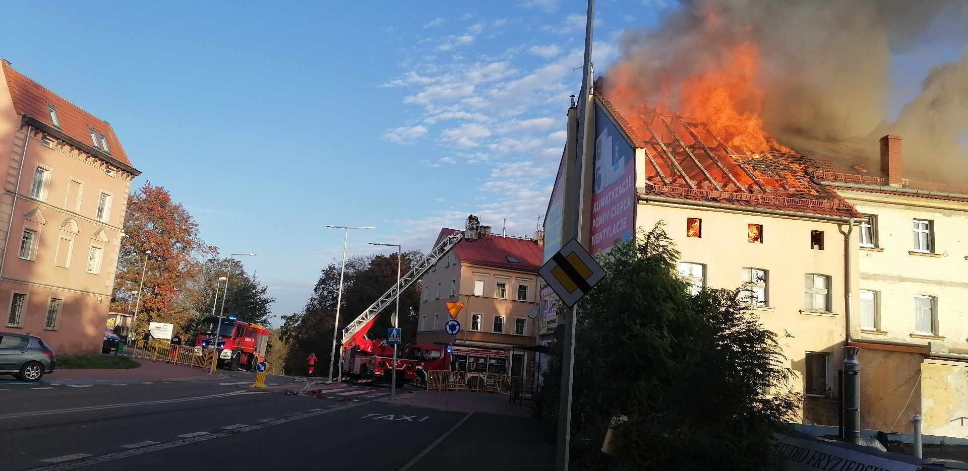 Miejsce zdarzenia zabezpieczono, spawiono drabinę mechaniczną, podnośnik i pięć linii gaśniczych. Pożarem objete było całe poddasze budynku.