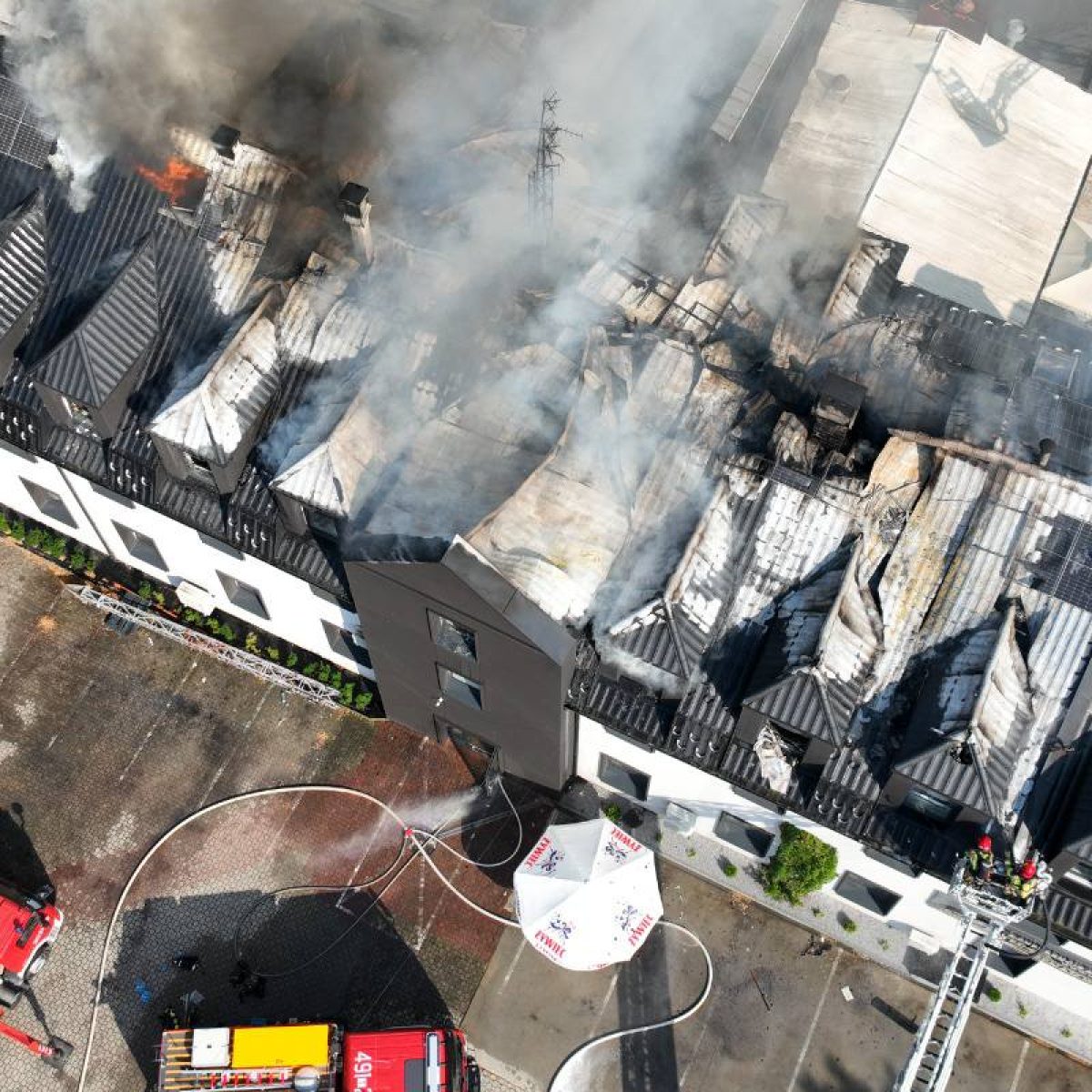 Na skutek uszkodzenia konstrukcji budynku doszło do zawalenia się dachu hali. Akcja gaśnicza trwała do południa. Uczestniczyło w niej kilkanaście zastępów PSP i OSP.