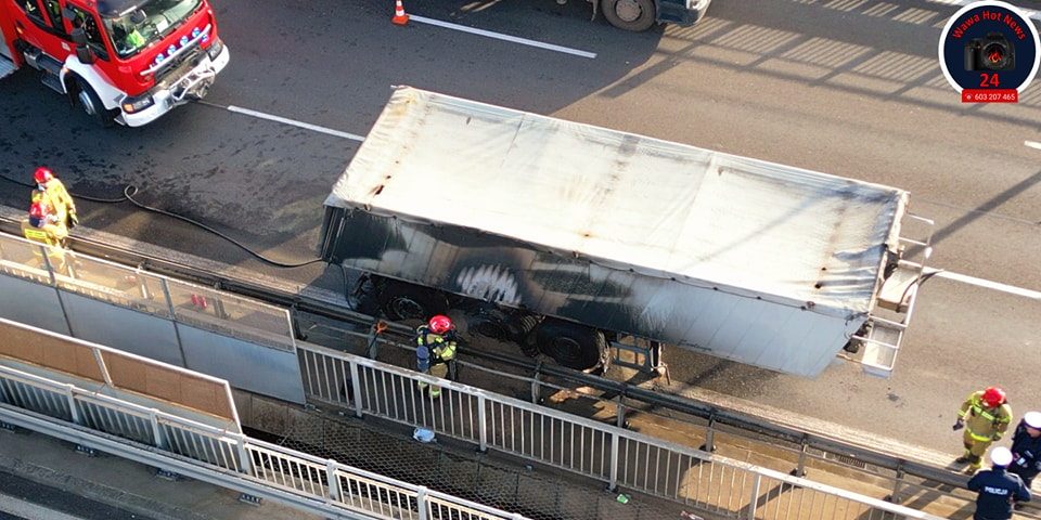 Wczoraj, około godziny 11:25, na trasie S8 w kierunku Poznania na wysokości stacji kolejowej Warszawa Toruńska doszło do pożaru w naczepie( typu patelnia) samochodu ciężarowego. W pojeździe, przewożącym piach zapaleniu uległ najpierw układ hamulcowy, następnie ogień zaczął przenosić się na naczepę.