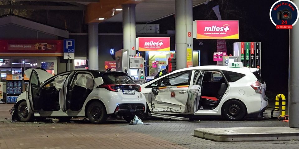 Mężczyzna poruszał się ul. Radzymińską w kierunku Marek i podczas zmiany pasa, doszło do zajechania drogi przez inny pojazd. Kierujący aby nie doprowadzić do zderzenia, zjechał na teren stacji benzynowej i rozpędem uderzył w stojącą przed dystrybutorze z gazem Toyotę oraz jej kierowcę. Następnie Toyota dalej uderzyła w Volkswagena, który uderzył w stojącą z boku Toyotę. Poszkodowana została również, inna Toyota która była po drugiej stronie stanowiska i przewracający dystrybutor uszkodził auto.