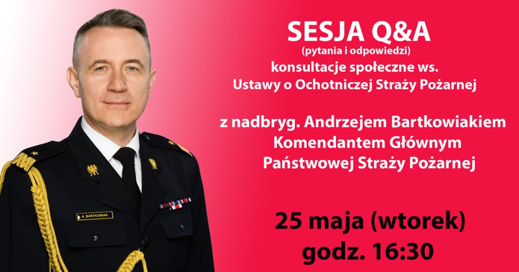Dziś, tj. 25 maja 2021 r. o godz. 16.30, Komendant Główny Państwowej Straży Pożarnej, nadbryg. Andrzej Bartkowiak weźmie udział w sesji Q&A (pytania i odpowiedzi) dotyczącej projektu Ustawy o Ochotniczej Straży Pożarnej.