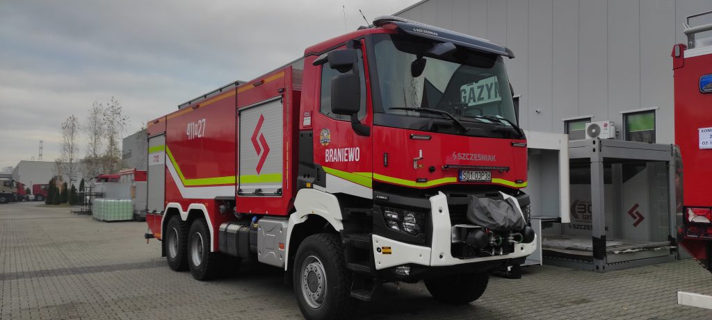 Braniewo Komenda Powiatowa Państwowej Straży Pożarnej w Braniewie w roku bieżącym wzbogaci się o nowy ciężki pojazd ratowniczo – gaśniczych na podwoziu Renault Trucks K440 P6X6 MEDIUM E6. Wóz zamówiła Komenda Wojewódzka Państwowej Straży Pożarnej w Olsztynie. Pojazd wyposażony jest w kompozytowe zbiorniki na wodę o pojemności 10 270 lit...