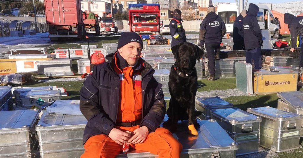 Polscy strażacy spod gruzów w Turcji uratowali 12 osób, pracowali ponad tydzień. Wśród 76 polskich strażaków, którzy wzięli udział w tej misji, bylo 17 warszawskich funkcjonariuszy, którym towarzyszył pies poszukiwawczy “Ruki”.