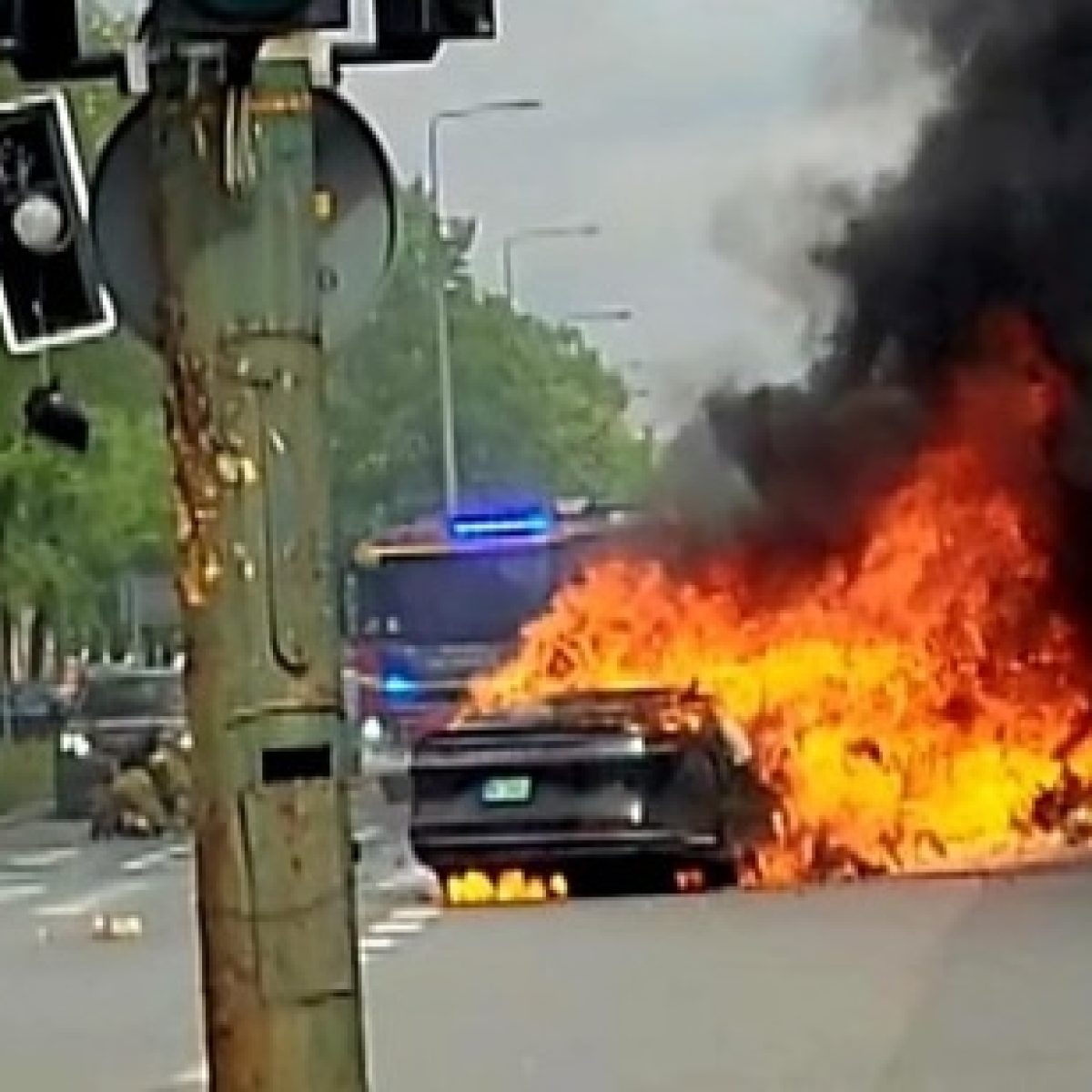 Chwile przed godziną 10:00 (19.04.2024) na skrzyżowaniu Alei Niepodległości z ulicą Madalińskiego w Warszawie samochód osobowy o zasilaniu elektrycznym uderzył w słup oświetleniowy (kierujący pojazdem próbował uniknąć zderzenia z innym pojazdem). W wyniku uderzenia w słup pojazd zapalił się. Na szczęście kierowca zdołał opuścić pojazd przed po...
