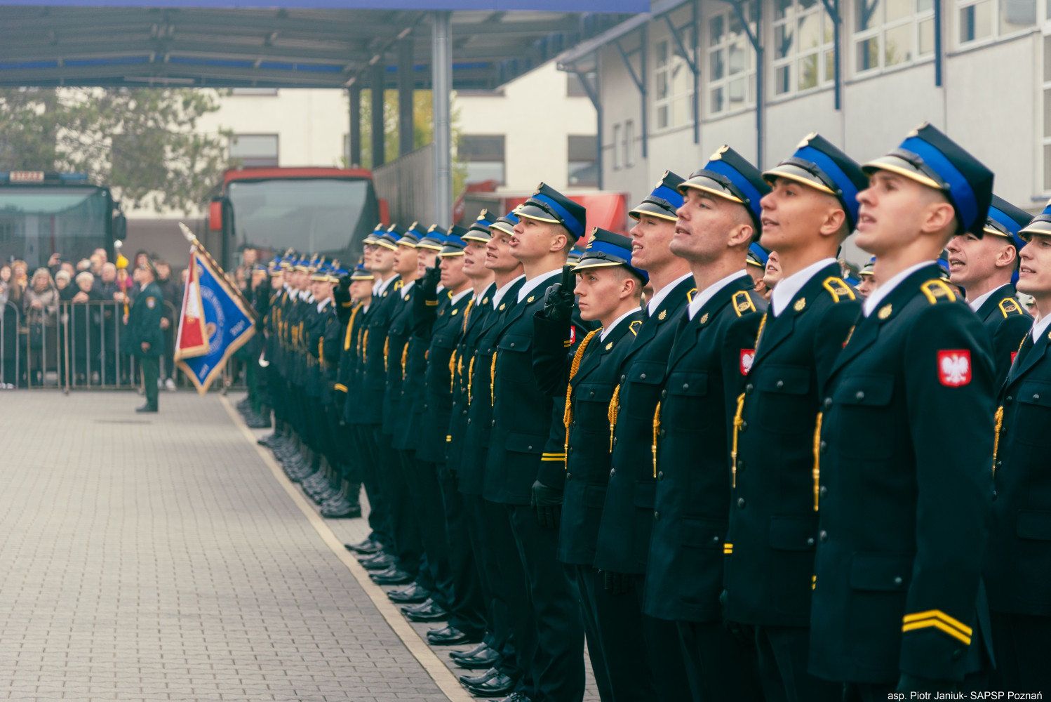 Kulminacyjnym punktem uroczystości odbywającej się na terenie SA PSP w Poznaniu było złożenie ślubowania na Sztandar przez słuchaczy Dziennego Studium Aspirantów, którzy powtarzając za komendantem szkoły st. bryg. Andrzejem Zajączkowskim wypowiadali słowa roty.